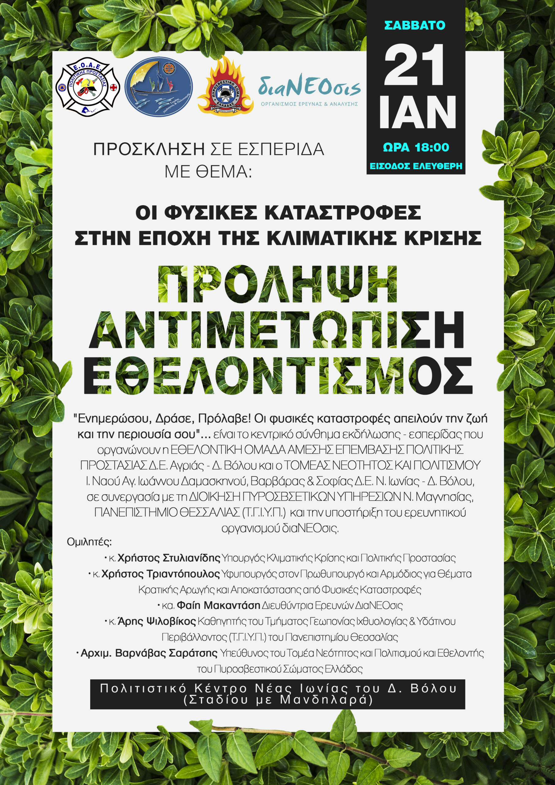 Θέμα της εκδήλωσης είναι Οι φυσικές καταστροφές στην εποχή της κλιματικής κρίσης: πρόληψη-αντιμετώπιση-εθελοντισμός και θα πραγματοποιηθεί το Σάββατο 21 Ιανουαρίου 2023 στις 18:00 το απόγευμα στο Πολιτιστικό Κέντρο Νέας Ιωνίας του Δ.Βόλου, με ελεύθερη είσοδο για τους πολίτες.
