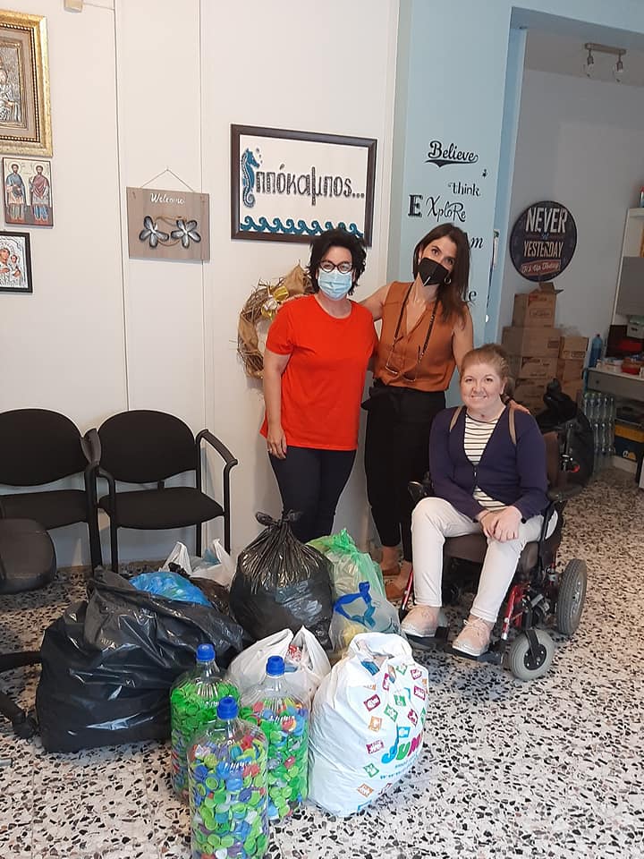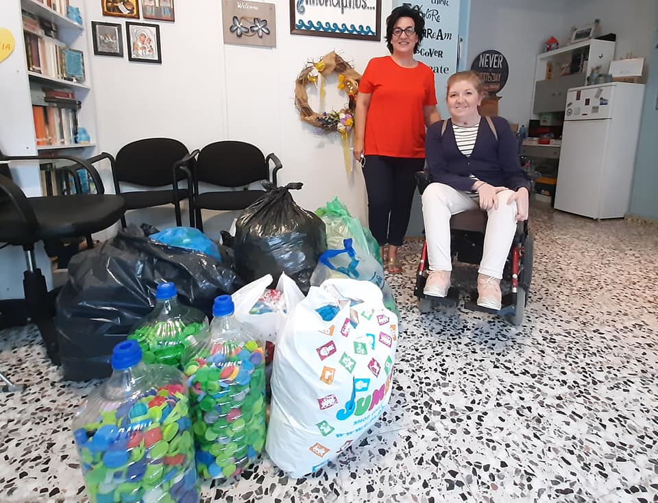 Η πρόεδρος του Σοροπτιμιστικού Ομίλου Βόλου ΘΕΤΙΣ Ασημίνα Σέγκλια με το μέλος Φωτεινή Κωστοπούλου παρέδωσαν χθες σημαντική ποσότητα από καπάκια στο Σωματείο Κινητικά Αναπήρων Μαγνησίας “Ιππόκαμπος” ως μια ελάχιστη συμβολή για την αγορά αμαξιδίου προωθώντας ταυτόχρονα την ιδέα της ανακύκλωσης.