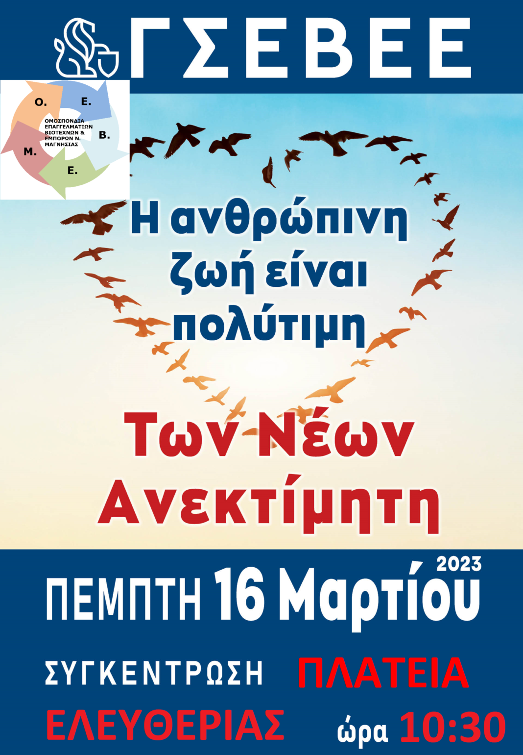 Καλούμε τα Πρωτοβάθμια Σωματεία Μέλη μας, τους Επαγγελματίες, Βιοτέχνες και Εμπόρους να συμμετέχουν στις κινητοποιήσεις την Πέμπτη 16 Μαρτίου 2023, στην Πλατεία Ελευθερίας και ώρα 10:30. Η Ο.Ε.Β.Ε.Μ. θα συμμετέχει με δίωρη στάση εργασίας από μας 10:00 έως μας 12:00 προς διευκόλυνση παρουσίας των Μελών μας στη συγκέντρωση στην Πλατεία Ελευθερίας.