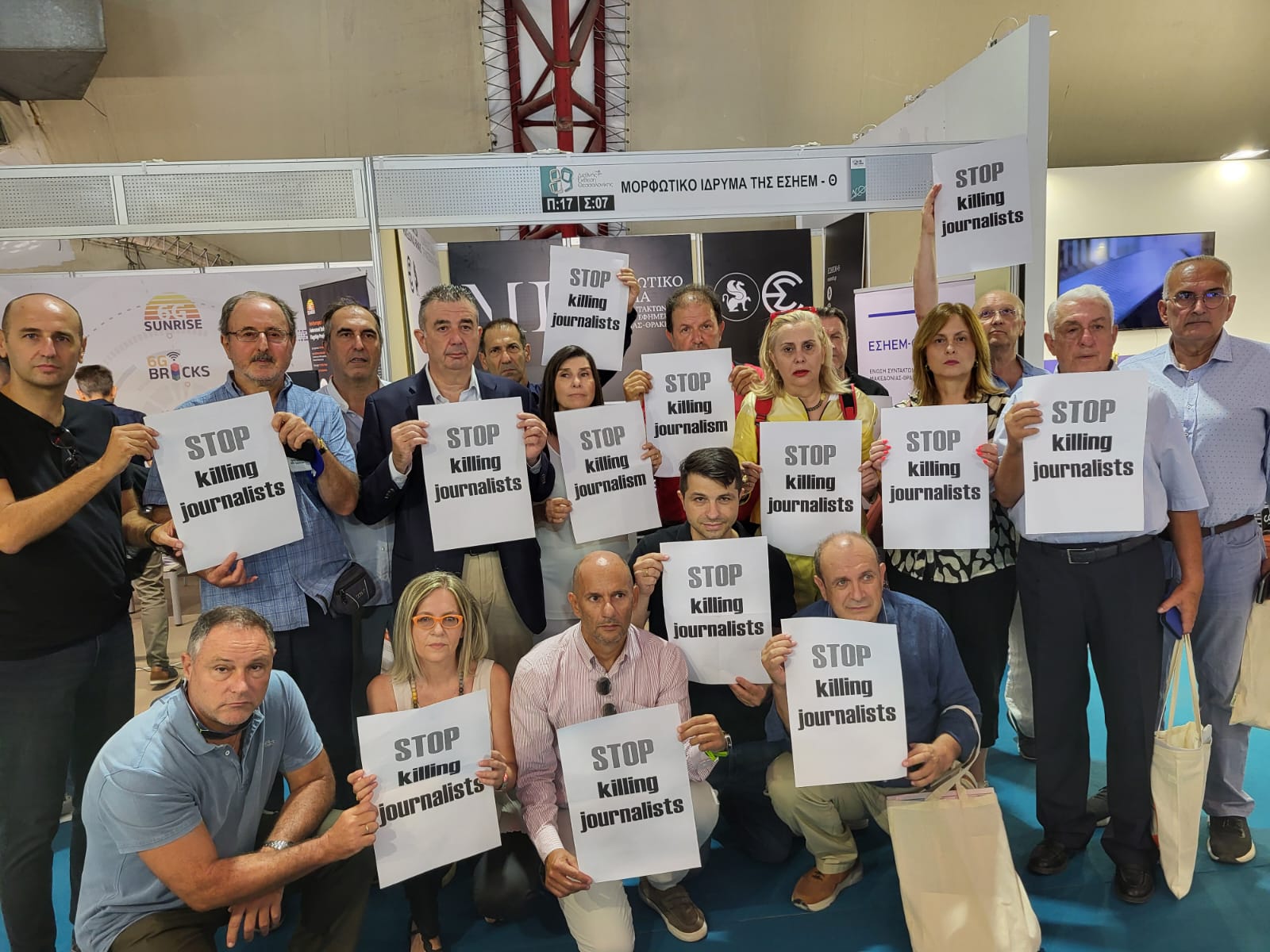 Με την ευκαιρία της επίσκεψης στο περίπτερο του Μορφωτικού Ιδρύματος της ΕΣΗΕΜ-Θ στην 89η ΔΕΘ, εκπρόσωποι του δημοσιογραφικού κόσμου προχώρησαν σε συμβολική διαμαρτυρία για τις δολοφονίες δημοσιογράφων στη Γάζα και σε άλλες εμπόλεμες ζώνες, στο πλαίσιο σχετικών δράσεων της Διεθνούς και της Ευρωπαϊκής Ομοσπονδίας Δημοσιογράφων.