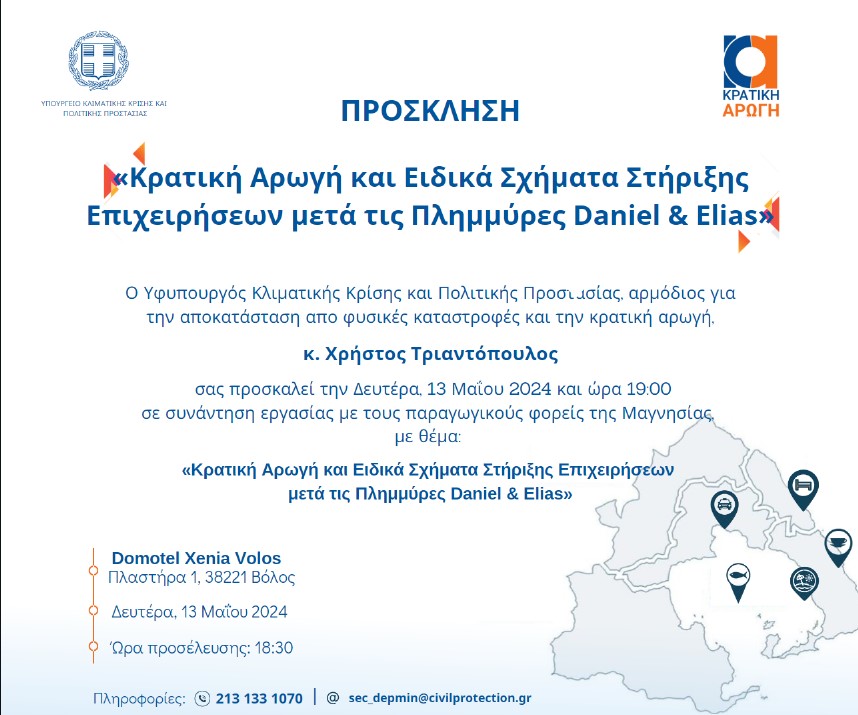 Συνάντηση εργασίας θα πραγματοποιήσει ο Υφυπουργός Κλιματικής Κρίσης και Πολιτικής Προστασίας, Αρμόδιος για Θέματα Κρατικής Αρωγής και Αποκατάστασης από Φυσικές Καταστροφές, κ Χρήστος Τριαντόπουλος, με φορείς της Μαγνησίας σχετικά με τα μέτρα στήριξης των επιχειρήσεων μετά τις πλημμύρες του Σεπτεμβρίου.