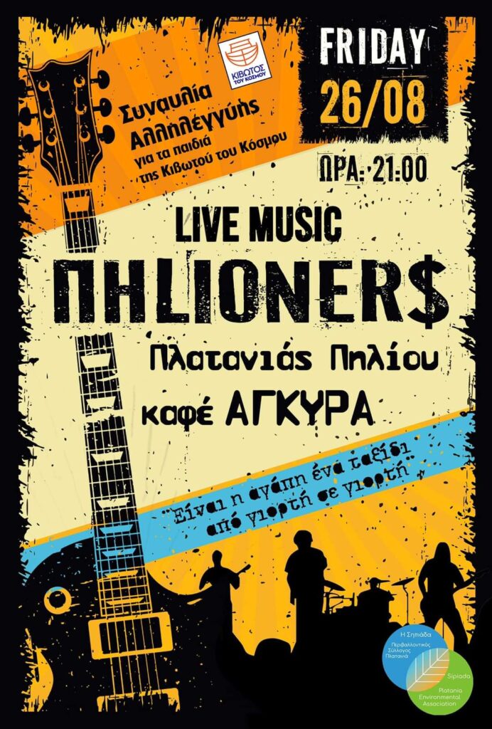 Απο τον Πολιτιστικο Σύλλογο του Πλατατανια Σηπιάδα, διοργανώνεται σρις 26/8 συναυλία αλληλεγγύης με τους ΠΗLIONER$ για τα παιδιά της κιβωτού του κόσμου ζητάμε την στήριξη και την αγάπη σας , προς το πρόσωπο των παιδιών μας και τις ανάγκες τους.