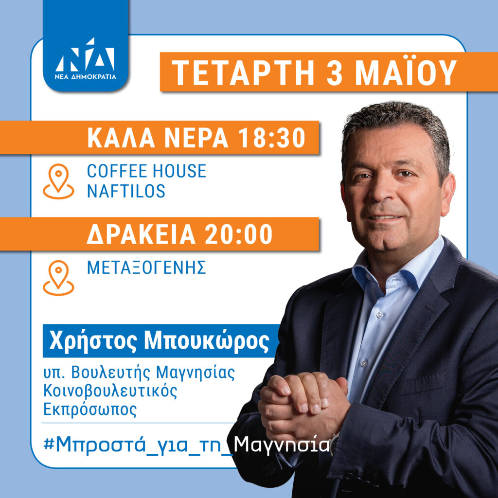 Αύριο Πέμπτη ο υποψήφιος βουλευτής Μαγνησίας, κοινοβουλευτικός εκπρόσωπος ΝΔ, θα επισκεφθεί τον Άνω Βόλο και θα μιλήσει στο καφέ Προφήλιον στις 6:00 το απόγευμα και εν συνεχεία στο Διμήνι όπου θα μιλήσει στις 8:30 το απόγευμα στο καφέ «Κουκουνάρι».