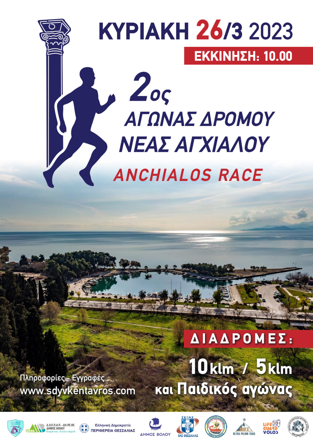 Ο Κένταυρος Βόλου, με την Περιφέρεια Θεσσαλίας, τη Διεύθυνση Αθλητισμού του ΔΟΕΠΑΠ-ΔΗΠΕΘΕ, τον Δήμο Βόλου-Κοινότητα Ν. Αγχιάλου, υπό την αιγίδα της ΕΑΣ ΣΕΓΑΣ Θεσσαλίας και την υποστήριξη της ΕΠΦΑ Μαγνησίας και του Ultra Pelion Trail, διοργανώνουν τον 2ο Αγώνα δρόμου Νέας Αγχιάλου την Κυριακή 26 Μαρτίου 2023, με διαδρομές 10χλμ και 5χλμ και παιδικό αγώνα 500 μέτρων “Feel my power Feninna” αφιερωμένος στη μνήμη της Φενίννας Βασιλού.