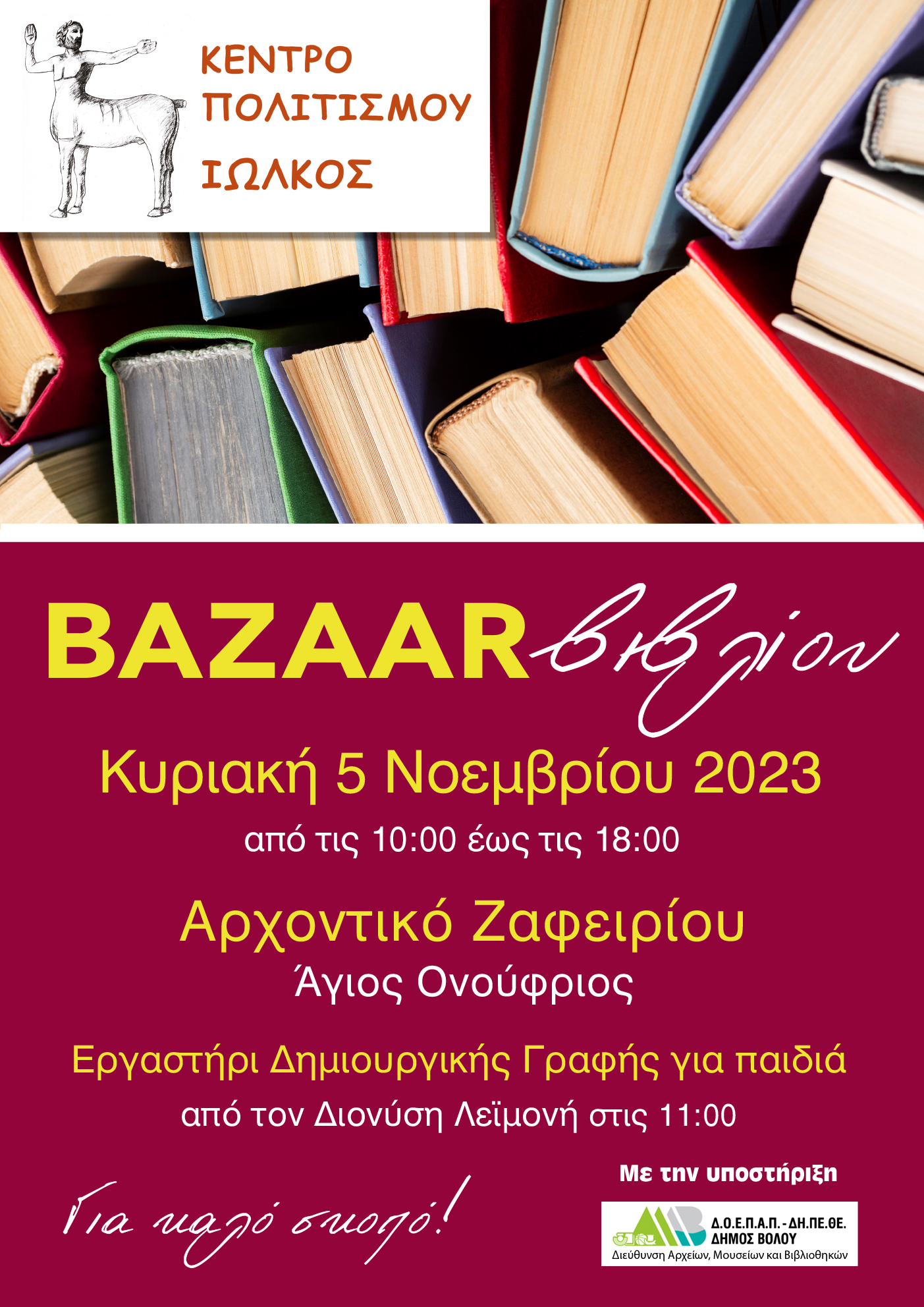 Το Κέντρο Πολιτισμού «Ιωλκός» διοργανώνει για 11η χρονιά Bazaar βιβλίου, την Κυριακή 5 Νοεμβρίου 2023, στην όμορφη αυλή του Αρχοντικού Ζαφειρίου στον Αγ. Ονούφριο , από τις 10 π.μ. έως τις 6 μ.μ. To Bazaar βιβλίου φέτος διοργανώνεται, σε συνεργασία με τον σύλλογο Γονέων και Κηδεμόνων του Δημοτικού σχολείου Ιωλκού και τον σύλλογο εκπ/κών του ίδιου σχολείου, ενώ έχει την υποστήριξη της Δ/νσης Αρχείων Μουσείων και Βιβλιοθηκών του Δήμου Βόλου. Όπως κάθε χρόνο, έτσι και φέτος, το Κέντρο Πολιτισμού «Ιωλκός», με απόλυτο σεβασμό στους επισκέπτες του Bazaar προσφέρει εξαιρετικά βιβλία σε χαμηλές τιμές, από 1 έως 5 ευρώ. Βιβλία τα οποία καλύπτουν όλες τις προτιμήσεις, όπως ελληνική και ξένη λογοτεχνία, ιστορικά, παιδικά, επιστημονικά, ποίηση και ταξιδιωτικά.Πεποίθησή μας είναι ότι το βιβλίο όχι μόνο είναι ένα μέσο ψυχαγωγίας, αλλά εμφανίζεται ως ο καλύτερος φίλος του ανθρώπου. Μας συντροφεύει τις ώρες της πλήξης και της μοναξιάς, ενώ ταυτόχρονα μας ψυχαγωγεί. Ακόμα το βιβλίο είναι ένας φίλος που μένει γιατί, όπως έχει γραφεί: είναι ένας συμπεριπατητής χωρίς απαιτήσεις, ένας φίλος που τον επικαλείσαι σε κάθε στιγμή και τον εγκαταλείπεις όταν θέλεις. Με αφορμή λοιπόν τη διοργάνωση του Bazaar οι φίλοι του Κέντρου Πολιτισμού Ιωλκός, θα έχουν την ευκαιρία να αγοράσουν ένα βιβλίο της προτίμησή τους σε εξαιρετικά χαμηλή τιμή και να ταξιδέψουν με αυτό.Τέλος, όπως ίσως γνωρίζετε, με αφορμή την ανακήρυξη του 2023, από το Υπουργείο Πολιτισμού, ως Λογοτεχνικό έτος Άλκη Ζέη, πραγματοποιήσαμε στις 28, 29 και 30 Αυγούστου, το καθιερωμένο τριήμερο Λογοτεχνίας αφιερωμένο στην τιμώμενη, αλλά και σε άλλες Ελληνίδες λογοτέχνιδες του 19ου και 20ου αι. Στο πλαίσιο αυτό, την ημέρα του Bazaar στις 11 π.μ., οργανώνουμε εργαστήρι δημιουργικής γραφής για παιδιά, με την επιμέλεια του γνωστού συμπολίτη μας συγγραφέα-φιλολόγου κ. Διονύση Λεϊμονή και τη συνεργασία του εκπαιδευτικού και αντ/ρου του Κέντρου Πολιτισμού κ. Νικ. Φιλάρετου. Μέσα από διάφορες δραστηριότητες δημιουργικής γραφής και όχι μόνο, τα παιδιά θα προσεγγίσουν ένα από τα γνωστότερα παιδικά μυθιστορήματα της Άλκης Ζέη «Το Καπλάνι της βιτρίνας». Το βραβευμένο αυτό έργο της συγγραφέως, που την καταξίωσε στην Ελλάδα και το εξωτερικό. Έχει μεταφραστεί σε 23 γλώσσες και έχει πωλήσει πάνω από 250 χιλ. αντίτυπα από το 1974 που πρωτοκυκλοφόρησε, ενώ έχει μεταφερθεί και στην τηλεόραση σε σειρά 10 επεισοδίων από την ΕΡΤ το 1990. Στο τέλος της δράσης, μια μικρή έκπληξη θα περιμένει μερικούς από τους συμμετέχοντες. Επίσης αξίζει να σημειώσουμε πως τα έσοδα από το ετήσιο Bazaar βιβλίου, όπως και των Χριστουγέννων που θα ακολουθήσει στις αρχές του Δεκέμβρη με χειροποίητα είδη από το εικαστικό εργαστήρι, αποτελούν τα βασικά έσοδα του Κέντρου Πολιτισμού, μεγάλο μέρος των οποίων επιστρέφει στις κοινωνικές δράσεις, στηρίζοντας οικογένειες και φορείς της περιοχής που έχουν ανάγκη.Σας περιμένουμε λοιπόν, την Κυριακή 5 Νοεμβρίου από τις 10 π.μ. έως τις 6 μ.μ στηνφιλόξενη αυλή του αρχοντικού Ζαφειρίου στον Άγιο Ονούφριο!Παράλληλα , αφού μας το επιτρέψει ο καιρός οι φίλοι που θα επισκεφθούν το Bazaar,θα έχουν την δυνατότητα να απολαύσουν το καφέ και το γλύκισμά τους , στην ολάνθιστη αυλή του Αρχοντικού.Σε περίπτωση κακοκαιρία το Bazaar , θα πραγματοποιηθεί μέσα στο Αρχοντικό Ζαφειρίου.