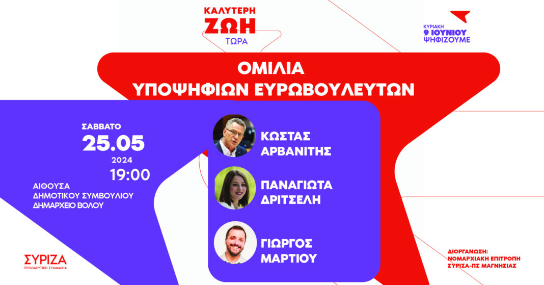 Η Νομαρχιακή Επιτροπή ΣΥΡΙΖΑ-ΠΣ Μαγνησίας διοργανώνει ανοιχτή εκδήλωση με τους/τις υποψήφιους/ες Ευρωβουλευτές με θέμα: “Η βαρύνουσα σημασία μιας Προοδευτικής Ευρωπαϊκής Πολιτικής σήμερα“, Σάββατο 25 Μαΐου στις 19:00 στην αίθουσα Δημοτικού Συμβουλίου στο Δημαρχείο Βόλου.