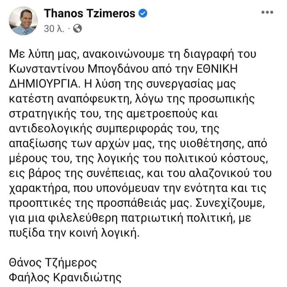 «Με λύπη μας, ανακοινώνουμε τη διαγραφή του Κωνσταντίνου Μπογδάνου από την ΕΘΝΙΚΗ ΔΗΜΙΟΥΡΓΙΑ. Η λύση της συνεργασίας μας κατέστη αναπόφευκτη, λόγω της προσωπικής στρατηγικής του, της αμετροεπούς και αντιδεολογικής συμπεριφοράς του, της απαξίωσης των αρχών μας, της υιοθέτησης, από μέρους του, της λογικής του πολιτικού κόστους, εις βάρος της συνέπειας, και του αλαζονικού του χαρακτήρα, που υπονόμευαν την ενότητα και τις προοπτικές της προσπάθειάς μας. Συνεχίζουμε, για μια φιλελεύθερη πατριωτική πολιτική, με πυξίδα την κοινή λογική.
