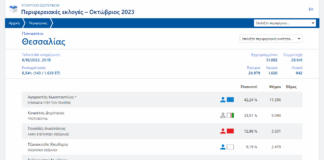 Επίσημα Αποτελέσματα Περιφέρεια Θεσσαλίας (20:15) : ΥΠ.ΕΣ. στο 8,54% των εκλογικών τμημάτων 42,24% ο Κ....