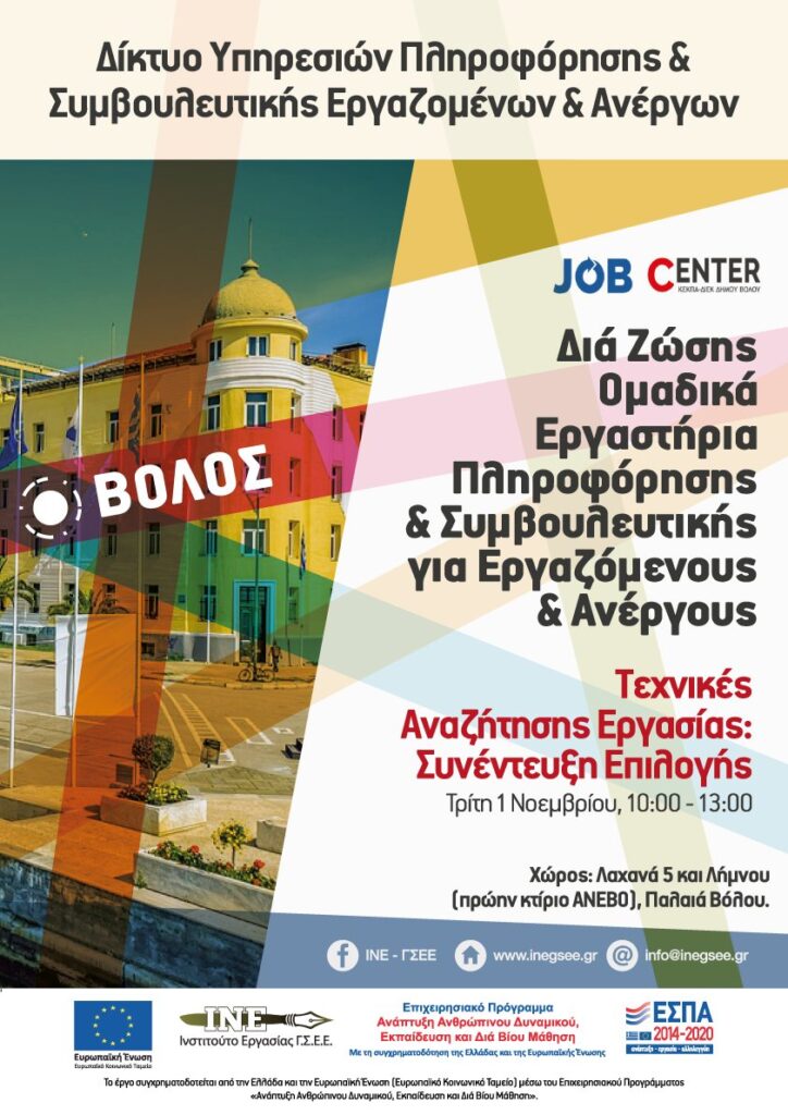 Σε ακολουθία της τηλε-δικτύωσης που είχε προηγηθεί τον Απρίλιο του 2022 μεταξύ των στελεχών του Job Center και τη δομή του Δικτύου Πληροφόρησης και Συμβουλευτικής Εργαζομένων και Ανέργων του ΙΝΕ-ΓΣΕΕ Θεσσαλίας και τέθηκαν τα θεμέλια για μία σημαντική συνεργασία, συνδιοργανώσαμε την Τρίτη1η Νοεμβρίου 2022 με θετική ανταπόκριση, δια ζώσης εργαστήριο με θέμα: “Τεχνικές Αναζήτησης Εργασίας: Συνέντευξη Επιλογής“.