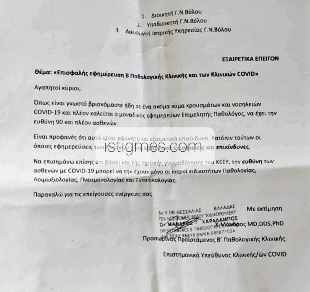 Το αποκαλυπτικό έγγραφο του κ. Μάνδρου με τίτλο “Επισφαλής εφημέρευση Β Παθολογικής και των Κλινικών Covid”