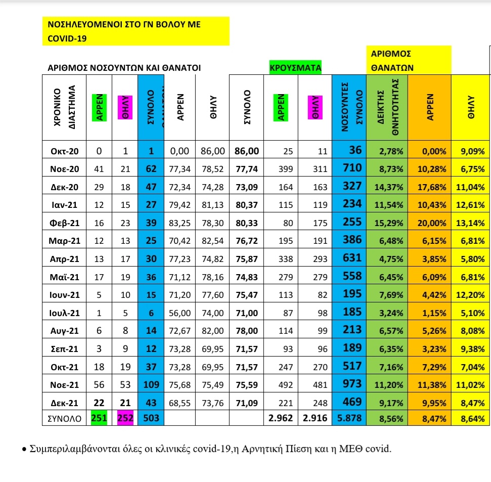 Δείτε τον πίνακα που έδωσε στη δημοσιότητα η Διοίκηση του Νομαρχιακού Νοσοκομείου Βόλου με τα στοιχεια εξελιξης τγς πανδημίας μήνα μήνα απο τον Οκτωβριο του 2020 μεχρι σήμερα στη Μαγνησία