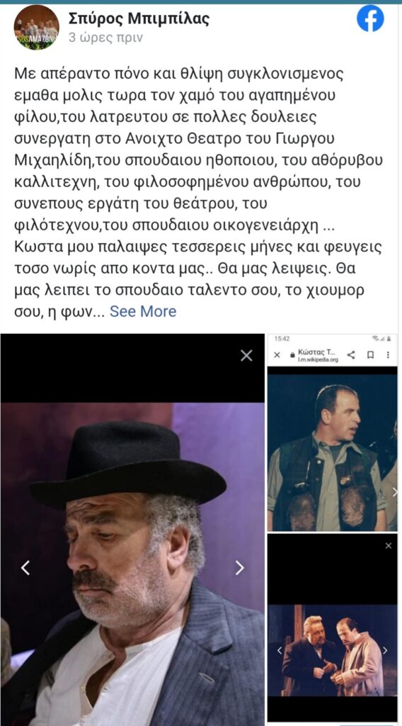 «Με απέραντο πόνο και θλίψη συγκλονισμένος έμαθα μόλις τώρα το χαμό του αγαπημένου φίλου, του λατρευτού σε πολλές δουλειές συνεργατη στο Ανοιχτο Θέατρο του Γιωργου Μιχαηλίδη,του σπουδαίου ηθοποιού, του αθόρυβου καλλιτεχνη, του φιλοσοφημένου ανθρώπου, του συνεπούς εργάτη του θεάτρου, του φιλότεχνου, του σπουδαίου οικογενειάρχη … Κώστα μου παλεψες τέσσερις μήνες και φεύγεις τόσο νωρίς απο κοντα μας.. Θα μας λειψεις. Θα μας λειπει το σπουδαιο ταλεντο σου, το χιουμορ σου, η φωνή σου που εντυσε τόσους ηρωες που λάτρεψαν τα παιδια στις μεταγλωττισεις.. Θα μας λείπει ενας σημαντικός ηθοποιός που ειχε την στόφα των μεγαλων σπουδαίων του παρελθόντος . ΜΕ ΤΙΜΗΣΕ Η ΦΙΛΙΑ ΣΟΥ, ΘΑ ΣΕ ΑΓΑΠΩ ΚΑΙ ΘΑ ΘΥΜΑΜΑΙ ΠΑΝΤΑ.. Η εξοδιος ακολουθια θα γινει εκτός Αθηνων σε στενό οικογενειακό κυκλο κι αντι στεφανων στην μνημη του Κωστα Τριανταφυλόπουλου,οποιος επιθυμει ενισχύει το Ταμείο αλληλοβοηθείας του σωματείου ελλήνων ηθοποιών».