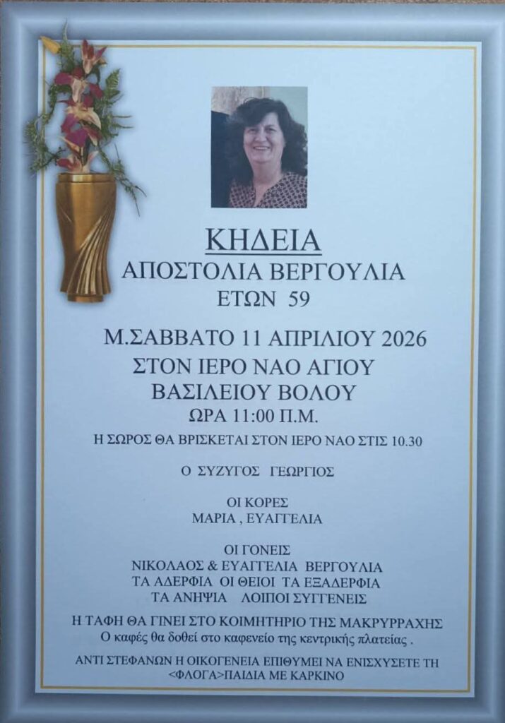 Η Αποστολία Βεργούλια ήταν δασκάλα στο 24ο Δημοτικό Σχολείο του Βόλου και ενεργό μέλος του Δ.Σ του Συλλόγου Απανταχού Μακρυραχιωτών “Γεώργιος Κανισκέρης”. Το πρωί ένιωσε έντονη αδιαθεσία στο κεφάλι και μεταφέρθηκε άμεσα από τους οικείους της στο Αχιλλοπούλειο. Μετά την αξονική τομογραφία στην οποία υποβλήθηκε κρίθηκε άμεση η ανάγκη από τους γιατρούς διακομιδής της στο Πανεπιστημιακό Νοσοκομείο όπου, φαίνεται ότι η κατάσταση της υγείας της χειροτέρεψε, με αποτέλεσμα να διασωληνωθεί και λίγες ώρες αργότερα να καταλήξει, αφήνοντας πίσω τις δύο κόρες της Μαρία και Ευαγγελία, τον σύζυγό της Γιώργο Γιαννούλη συνταξιούχο αστυνομικό, τους γονείς, τον αδερφό της και τους λοιπούς συγγενείς της.