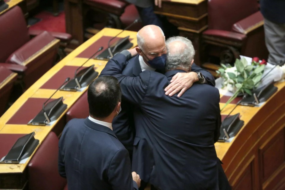 Ο πρόεδρος της Βουλής Κώστας Τασούλας, που άφησε ένα μπουκέτο λευκά λουλούδια στο σημείο όπου καθόταν η Φώφη Γεννηματά, με τα δυο του χέρια κρατούσε το πρόσωπο του Βασίλη Κεγκέρογλου του ΠΑΣΟΚ που ξέσπασε σε δάκρυα, αφού άφησε και αυτός λίγα λουλούδια στα έδρανα.