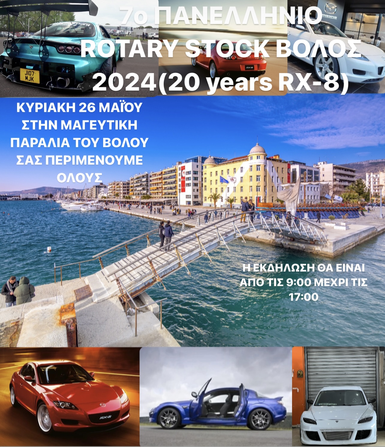 Η αναβληθείσα εκδήλωση 7ο Πανελλήνιο Rotary Stock Βόλος 2023 (20 Years RX-8) από τον Σεπτέμβρη του 2023, λόγω των ακραίων καιρικών συνθηκών και των καταστροφών που επακολούθησαν στην περιοχή του Βόλου εκείνη την περίοδο, πρόκειται να πραγματοποιηθεί με το ίδιο ακριβώς περιεχόμενο και πρόγραμμα, την Κυριακή 26 Μαΐου 2024 στην παραλία της πόλης και συγκεκριμένα στο σημείο που βρίσκεται το Μνημείο Ηρώων.