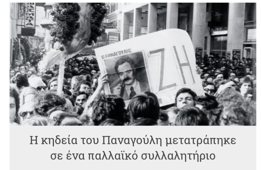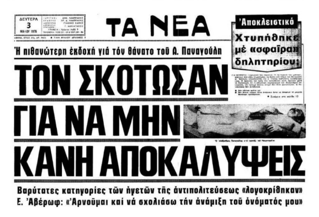 Χαράματα Πρωτομαγιάς του 1976 ο Αλέκος Παναγούλης σκοτώθηκε σε αυτοκινητιστικό δυστύχημα. Πριν από λίγα χρόνια είχε κάνει απόπειρα δολοφονίας εναντίον του δικτάτορα Παπαδόπουλου. Απέτυχε και βασανίστηκε από τους χουντικούς. “Ήταν ο μοναδικός που δεν υπέκυψε. Ο μοναδικός που δεν λύγισε ποτέ., δήλωνε ένας από τους βασανιστές του, ο Θεοφιλογιαννάκος. Δεν έσπασε. Δεν κατέδωσε τους συντρόφους του. 1η Μαιου 1976 ο πολιτικός και αγωνιστής κατά της χούντας των συνταγματαρχών Αλέκος Παναγούλης οδηγούσε επί της λεωφόρου Βουλιαγμένης με προορισμό φιλικό σπίτι του στη Γλυφάδα, όπου θα γιόρταζε την πρωτομαγιά. Επέβαινε σε ένα πράσινο Fiat Mirafiori, το οποίο του είχε κάνει δώρο η σύντροφός του, Οριάνα Φαλάτσι. Έτρεχε με μεγάλη ταχύτητα, ενώ δίπλα του υπήρχαν ένα ή δύο αυτοκίνητα, που έμοιαζαν να κάνουν κόντρα μαζί του. Ο Παναγούλης έχασε τον έλεγχο και καρφώθηκε σε ένα υπόγειο κατάστημα επί της λεωφόρου, κάθετα στην πορεία του. Μέσα σε λίγα λεπτά ξεψύχησε. Λίγες ώρες μετά τον θάνατο του φτάνει στην Αθήνα η σύντροφος του Αλέκου Παναγούλη και διάσημη Ιταλίδα δημοσιογράφος, Οριάνα Φαλάσι. «Ήταν το ίδιο σαν να ήθελα να ζεστάνω ένα μαρμάρινο άγαλμα με το σχήμα, τα χαρακτηριστικά και τη θύμηση αυτού που ήσουν ως πριν από δεκαεφτά ώρες, και μια ανίσχυρη οργή με διαπέρασε, μια βεβαιότητα με τη γεύση του μίσους: δεν σε είχαν σκοτώσει τυχαία, δεν σε είχαν σκοτώσει από λάθος, σε είχαν σκοτώσει για να μην τους ενοχλείς πια», γράφει στο βιβλίο “Ένας άντρας”, που αφιέρωσε στον Αλέκο Παναγούλη.