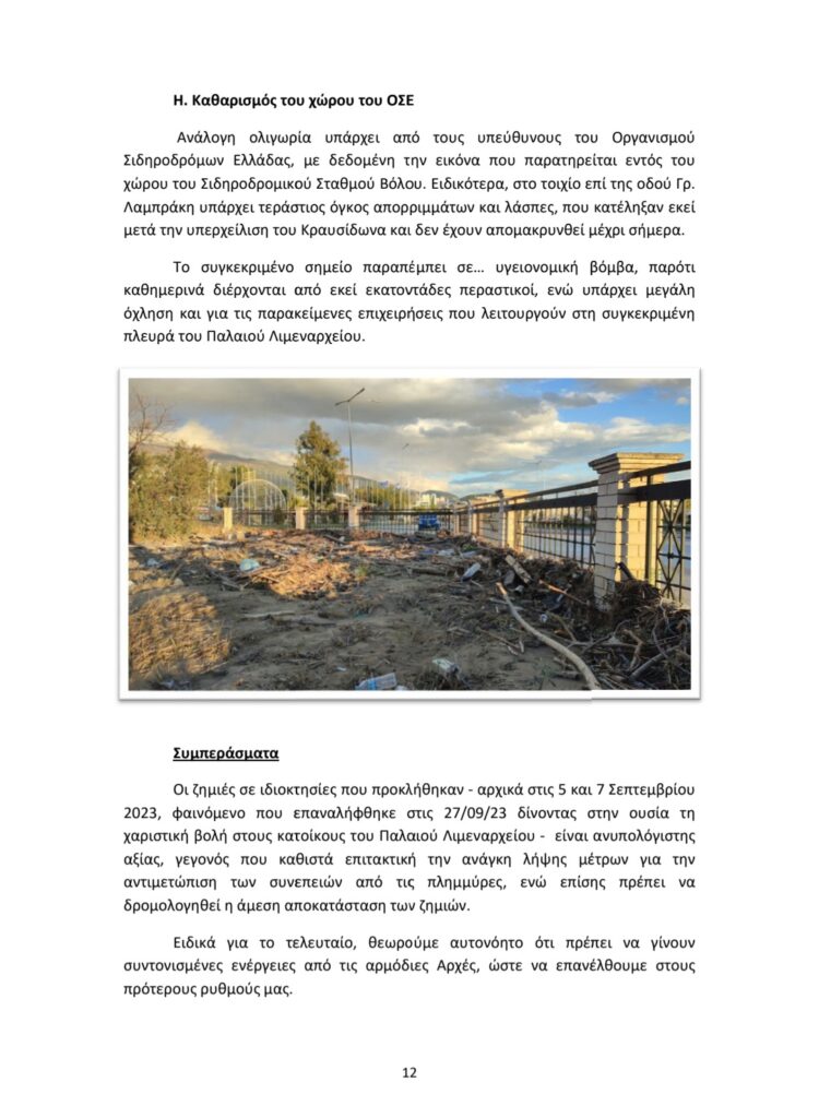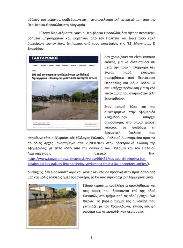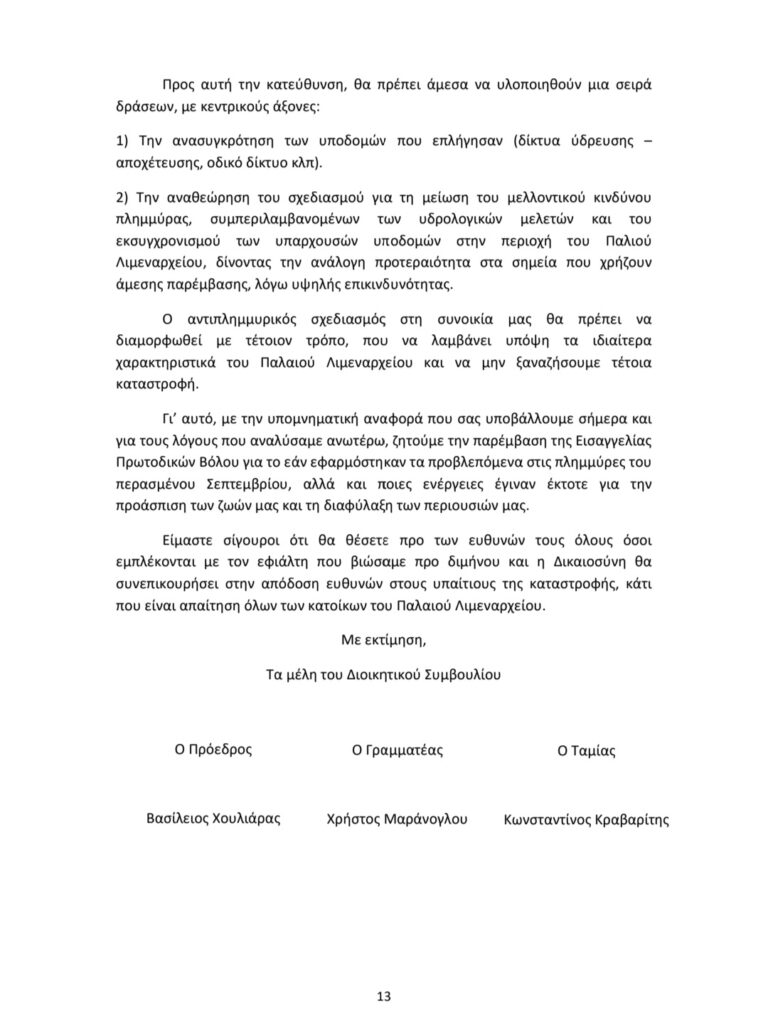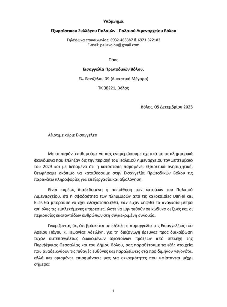 Το υπόμνημα που κατατέθηκε προσφάτως στην Εισαγγελία Πρωτοδικών Βόλου από τον Εξωραϊστικό Σύλλογο Παλαιών – Παλαιού Λιμεναρχείου και αναδεικνύει καίρια ζητήματα σχετικά με τις πλημμύρες του περασμένου Σεπτεμβρίου στον Βόλο, εστιάζοντας στις σοβαρές καταστροφές που υπέστη ολόκληρη η συνοικία έδωσαν στην δημοσιότητα οι κάτοικοι.