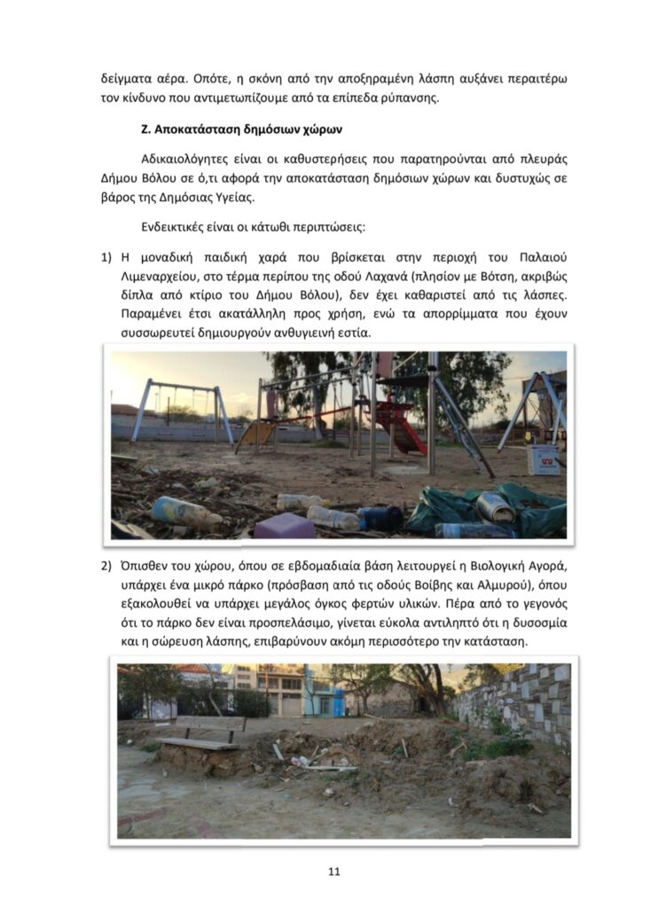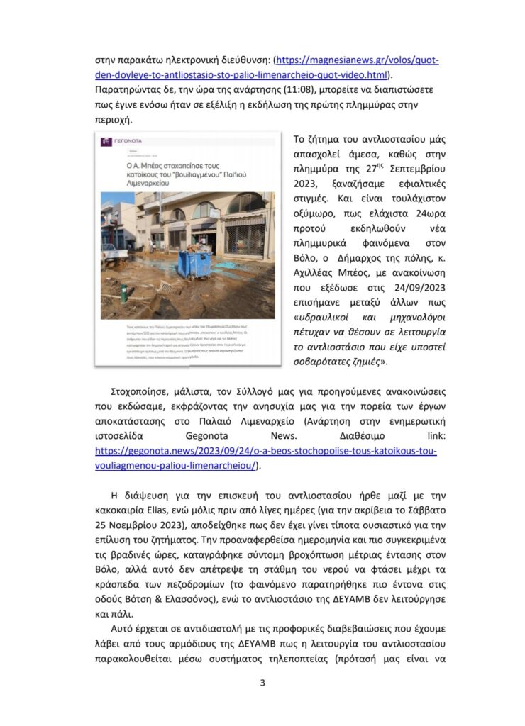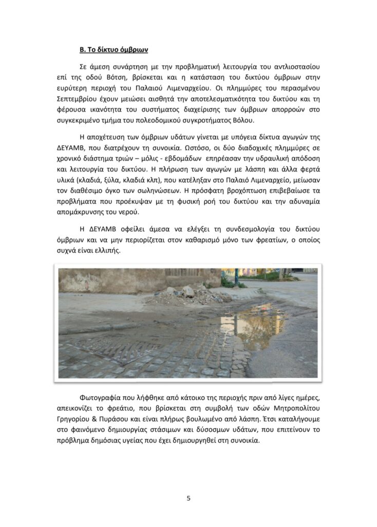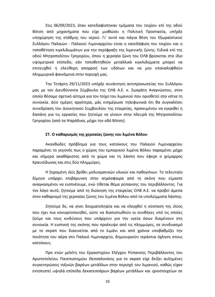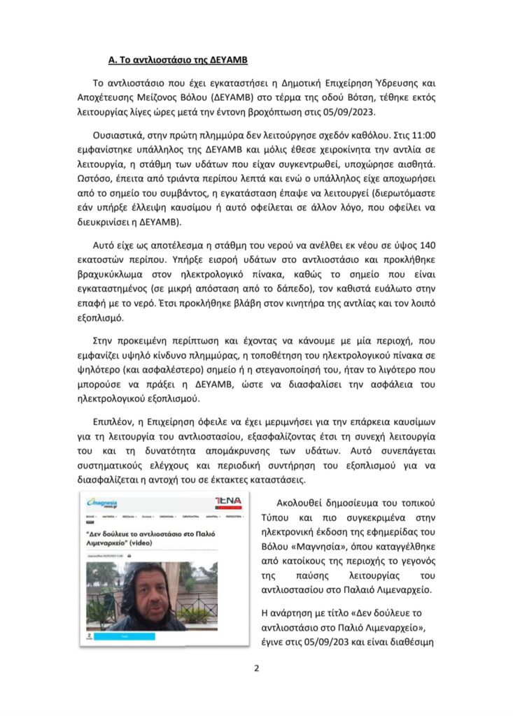 Το υπόμνημα που κατατέθηκε προσφάτως στην Εισαγγελία Πρωτοδικών Βόλου από τον Εξωραϊστικό Σύλλογο Παλαιών – Παλαιού Λιμεναρχείου και αναδεικνύει καίρια ζητήματα σχετικά με τις πλημμύρες του περασμένου Σεπτεμβρίου στον Βόλο, εστιάζοντας στις σοβαρές καταστροφές που υπέστη ολόκληρη η συνοικία έδωσαν στην δημοσιότητα οι κάτοικοι.