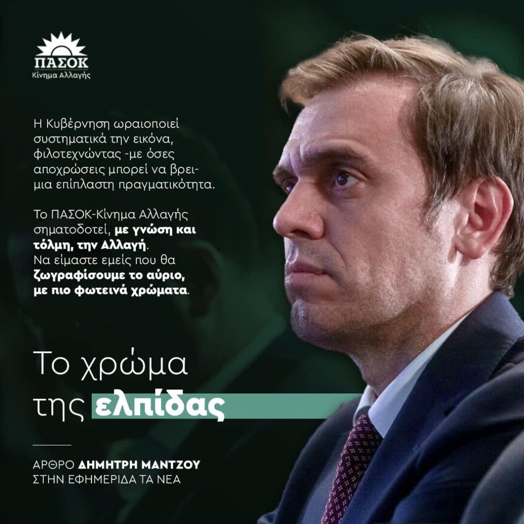 Το ΠΑΣΟΚ-Κίνημα Αλλαγής σηματοδοτεί, με γνώση και τόλμη, την αλλαγή. Παρεμβαίνει στη δημόσια ζωή -καθημερινά, μήνες τώρα- με θέσεις και προτάσεις. Για φορολογική δικαιοσύνη, με ανακούφιση των πιο αδύναμων και έκτακτη φορολόγηση των υπερκερδών των ισχυρών. Για αποτελεσματικούς ελέγχους στην αγορά -με διαρκή ενημέρωση για την επιβολή καθώς και για την είσπραξη προστίμων για αισχροκέρδεια. Και φυσικά, για γενναία μέτρα ρύθμισης της αγοράς ενέργειας, με το πλαφόν στη λιανική τιμή, για άμεσες, ευεργετικές συνέπειες στον προϋπολογισμό πολιτών, επιχειρήσεων, αλλά και του ίδιου του Κράτους.Σχεδιάζουμε πολιτικές για δίκαιη κατανομή, όχι μόνο των βαρών, αλλά και του οφέλους κάθε μελλοντικής ανάπτυξης. Με ένα και μόνο σκοπό: την επιστροφή της ελπίδας και της αξιοπρέπειας στη ζωή όλων. Γιατί, τελικά, το ζήτημα δεν είναι να δείχνουμε μόνο τις κυβερνητικές «μουντζούρες». Αλλά να είμαστε εμείς που θα ζωγραφίσουμε το αύριο, με πιο φωτεινά χρώματα.