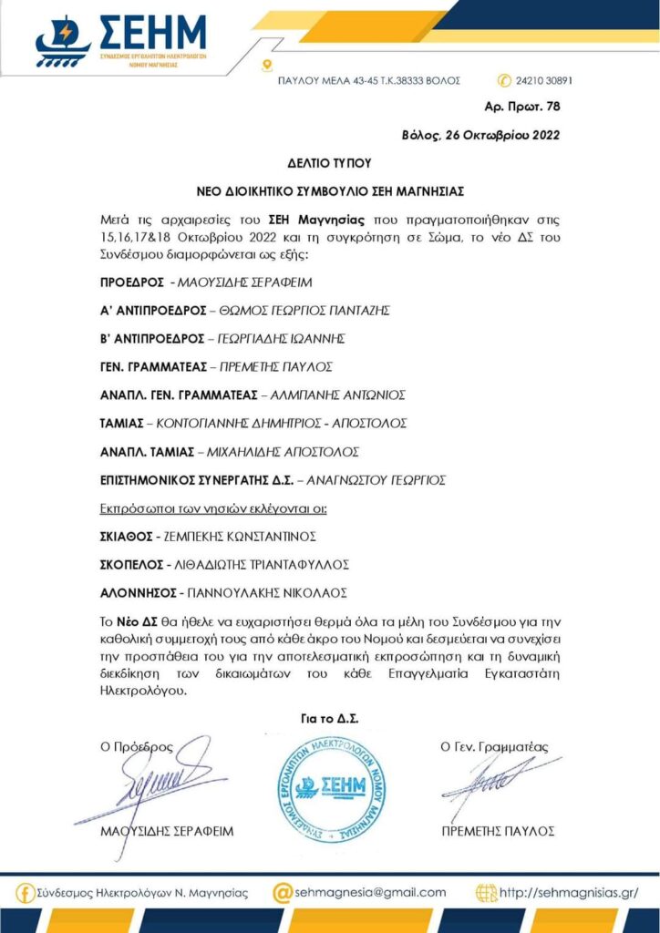 Μετά τις αρχαιρεσίες του ΣΕΗ Μαγνησίας που πραγματοποιήθηκαν στις 15,16,17&18 Οκτωβρίου 2022 και τη συγκρότηση σε Σώμα, το νέο ΔΣ του Συνδέσμου διαμορφώνεται ως εξής: