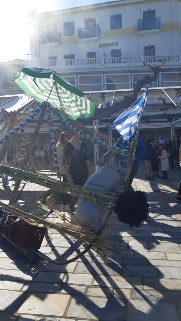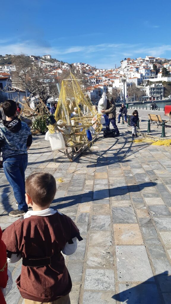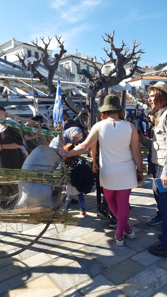 Οι αποκριές στη Σκόπελο είχαν και έχουν ζωηράδα, φωνές, τενεκεδοθορυβο, κρασί, κρεατοφαγια, γλέντι, κέφι χορό στην προκυμαία και στα στενοσοκακια με περπασ’κα(Διονυσιακα ) με επιδόρπιο ρυζόγαλο και γαλατόπιτα. Προφανώς αναφέρομαι στο πανάρχαιο εθιμο της “τράτας” με τους τραταραιους και τις μ’τσουνες που γιορτάζεται Κυριακή της αποκριάς που είχε τις ρίζες του στο Διόνυσο και στην φημισμένη ναυπηγικη τέχνη των καραβομαραγκων της Σκοπέλου που ταξίδευαν Κωνστ/πολη, Ταιγανιο, Βραιλα, Οδησσο, Γαλαξίδι, Συρα, Σκιάθο και αλλού για να κτίσουν κάθε είδος σκαριού όπως: σκαμπαβία (ελαφρύ μικρό σκάφος βοηθητικο), οκλαδες (μαουνες),μπρίκια, καραβοσκαρα, περάματα κλπ και φυσικά στους ταρσανάδες του νήσου. Οι ξενιτεμένοι καραβομαραγκοι και ναυτικοί που μοχθούσαν και κοπίαζαν εκαναν θυσια μεγαλη να βρεθουν στις μεγαλες γιορτες της χριστιανοσυνης στα σπιτια τους. Με το που “άνοιγε” το τριόδι ,η λατρεία ,ο ποθος ,η νοσταλγια ητο τοσο εντονη και συγκινητικη που εψαχναν πως θα βρουν τροπο να φθασουν στη πατριδα.