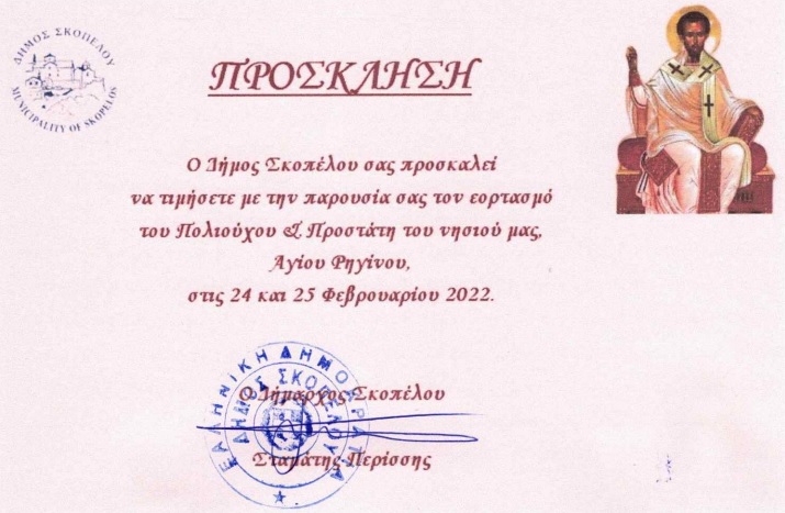 Την Παρασκευή 25 Φεβρουαρίου 2022, θα τελεσθεί η Πανήγυρις του Ιερομάρτυρος ΑΓΙΟΥ ΡΗΓΙΝΟΥ Επισκόπου Σκοπέλου και πολιούχου της νήσου μας.