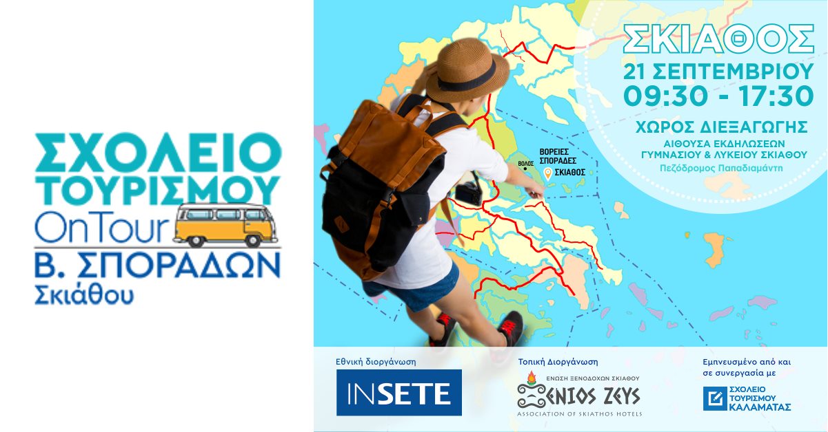 Το Σχολείο Τουρισμού OnTour Β. ΣΠΟΡΑΔΩΝ – Σκιάθου θα πραγματοποιηθεί το Σάββατο, 21 Σεπτεμβρίου 2019 στις 9:30 π.μ. – 5:30 μ.μ Το Σχολείο Τουρισμού OnTour είναι μία νέα εκπαιδευτική, μη κερδοσκοπική δράση, η οποία γεννήθηκε από τη σύμπραξη του ΙΝΣΕΤΕ και του ΣΧΟΛΕΙΟΥ ΤΟΥΡΙΣΜΟΥ ΚΑΛΑΜΑΤΑΣ. Την εθνική διοργάνωση των Σχολείων Τουρισμού OnTour επιμελείται το ΙΝΣΕΤΕ, σε συνεργασία με τους εκάστοτε τοπικούς διοργανωτές.
