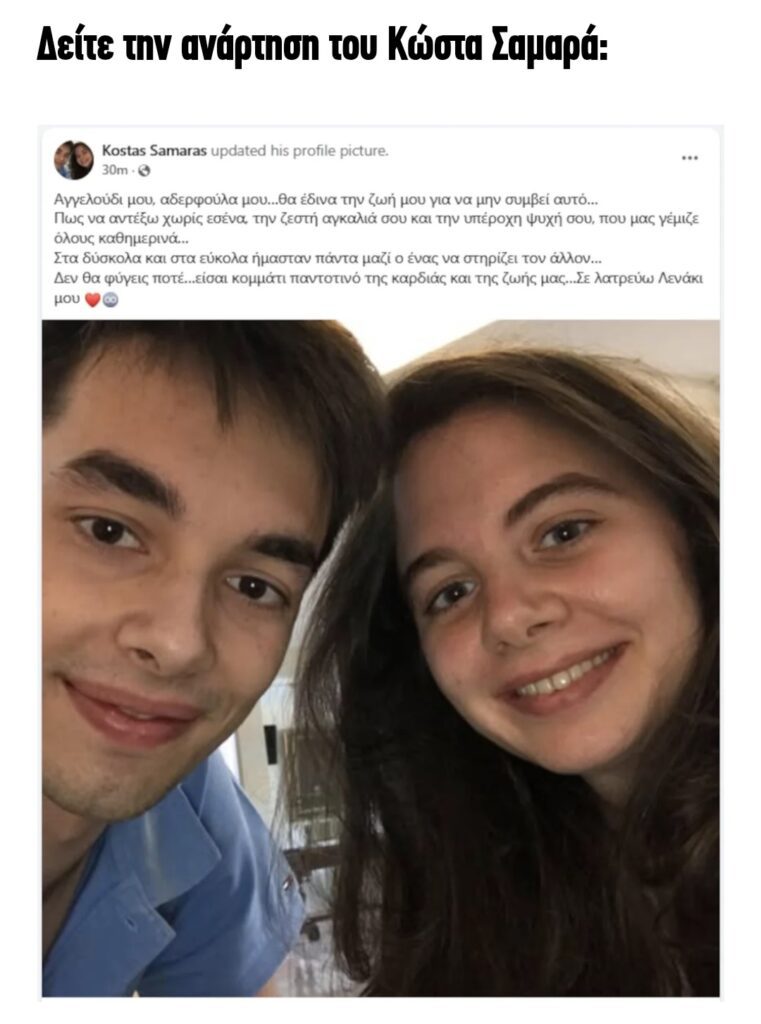 Με ένα σπαρακτικό μήνυμα ο Κώστας Σαμαράς, γιος του πρώην πρωθυπουργού Αντώνη Σαμαρά, αποχαιρετά την αδελφή του, τη Λένα, που έφυγε ξαφνικά από τη ζωή.Υπενθυμίζεται ότι η κόρη του πρώην πρωθυπουργού, Αντώνη Σαμαρά, έφυγε από τη ζωή το βράδυ της Πέμπτης (7/8) σε ηλικία 34 ετών.Σήμερα, ο αδερφός της Κώστας Σαμαράς με ανάρτησή του στο Facebook την αποχαιρέτησε με ένα μήνυμα που ραγίζει καρδιές. «Αγγελούδι μου, αδερφούλα μου…θα έδινα την ζωή μου για να μην συμβεί αυτό… Πως να αντέξω χωρίς εσένα, την ζεστή αγκαλιά σου και την υπέροχη ψυχή σου, που μας γέμιζε όλους καθημερινά… Στα δύσκολα και στα εύκολα ήμασταν πάντα μαζί ο ένας να στηρίζει τον άλλον… Δεν θα φύγεις ποτέ…είσαι κομμάτι παντοτινό της καρδιάς και της ζωής μας…Σε λατρεύω Λενάκι μου», γράφει στην ανάρτησή του ο Κώστας Σαμαράς, την οποία συνοδεύει με μια φωτογραφία.