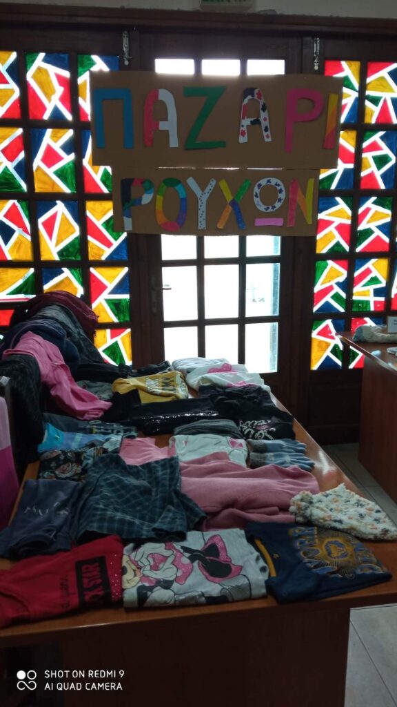 Ταυτόχρονα λειτουργεί και έκθεση με ‘’ανακυκλωμένα’’ ρούχα για να βλέπουνε οι μαθητές ότι υπάρχουν δυνατότητες διαφορετικής χρήσης αυτών των προϊόντων.