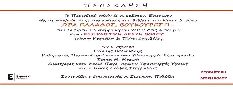 Το βιβλίο του δημοσιογράφου Ν.Στέφου για το βέτο στο Βουκουρέστι για την είπα οδό των Σκοπίων στο ΝΑΤΟ επί κυβερνήσεως Κώστα Καραμανλή, παρουσιάζεται αύριο Τετάρτη στις 6:30 στην Εξωραϊστική Λέσχη του Βόλου. Το βιβλίο θα παρουσιάσουν ο πρώην υφυπουργός Εξωτερικών Γιάννης Βαληνάκης και η πρώην υφυπουργός Ζέττα Μακρή.