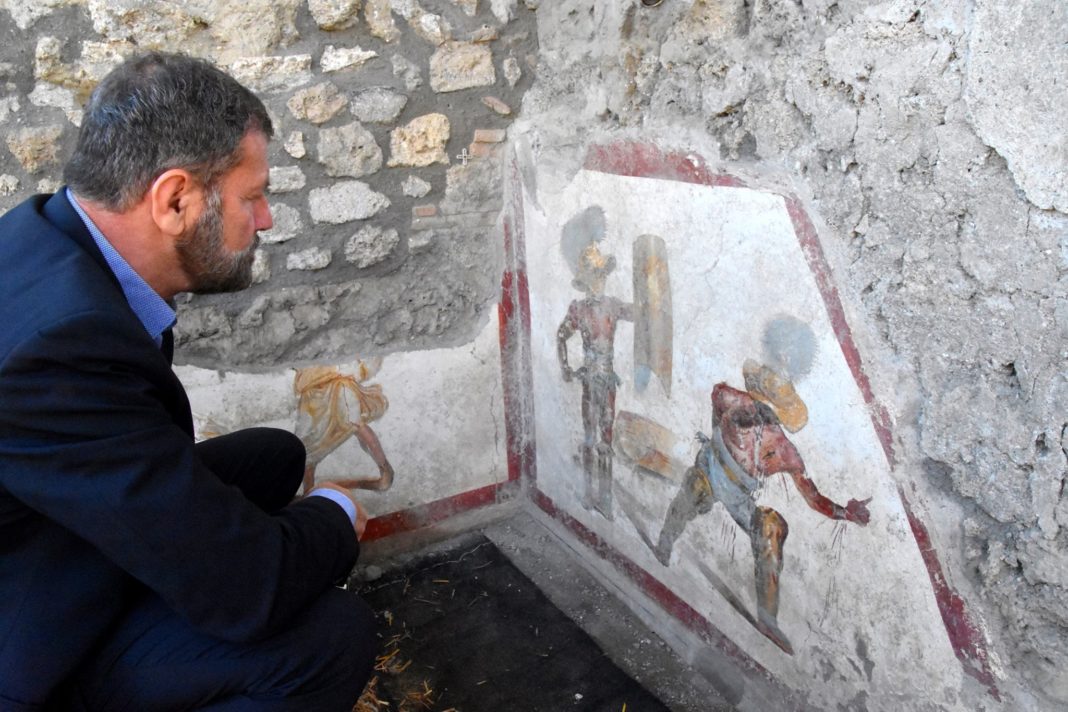 Η τοιχογραφία, έχει πλάτος 1.5 μέτρα, βρέθηκε σε υπόγειο χώρο καταστήματος, με τους αρχαιολόγους να κάνουν λόγο για ταβέρνα ή ακόμα και οίκο ανοχής, που δεχόταν συχνές επισκέψεις από μονομάχους.