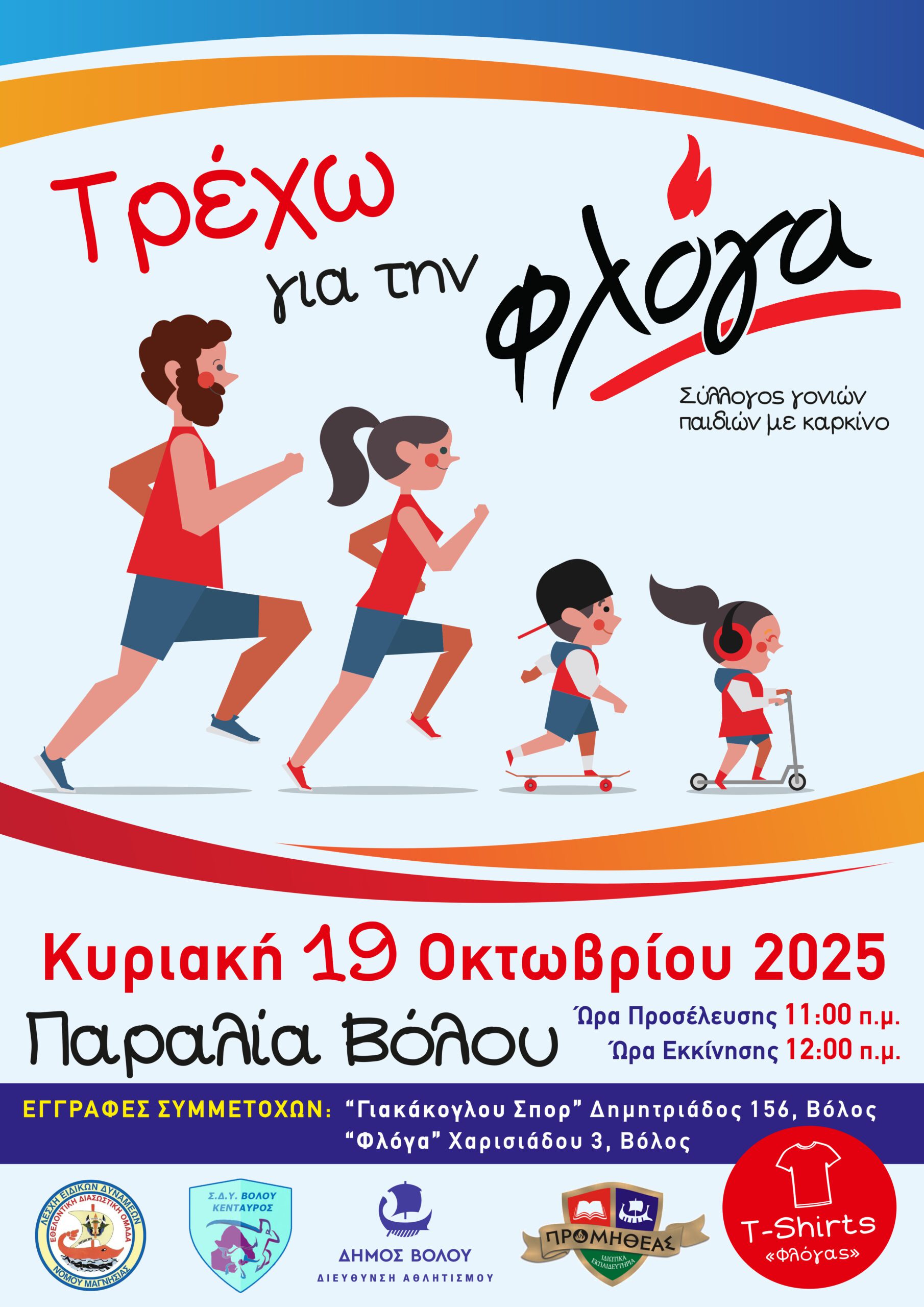 Ο Σύλλογος Γονέων Παιδιών με καρκίνο η «ΦΛΟΓΑ» Μαγνησίας, η Διεύθυνση Αθλητισμού Δήμου Βόλου, ο Ιατρικός σύλλογος Μαγνησίας, ο Κένταυρος Βόλου και ηΛέσχη Ειδικών Δυνάμεων Μαγνησίας σας προσκαλούν σε μια ξεχωριστή δρομική εκδήλωση με σύνθημα «Τρέχω για τη ΦΛΟΓΑ».Η γιορτινή αθλητική «βόλτα» θα πραγματοποιηθεί την Κυριακή 19 Οκτωβρίου 2025 στις12:00 στην παραλία του Βόλου, με την εκκίνηση στο ύψος της Αργούς και διανύοντας μία μικρή διαδρομή των 2 χιλ. περίπου. Όλοι ανεξαιρέτως μπορούμε να τρέξουμε με το ρυθμό μας, ή και να περπατήσουμε, χαρίζοντας τη στήριξή μας στον αγώνα ζωής των παιδιών της Φλόγας, με ένα συμβολικό αντίτιμο. Δηλώσεις συμμετοχής γίνονται στα γραφεία της “ΦΛΟΓΑΣ” στο Βόλο, Χαρισιάδου 3(πρώην ΠΙΚΠΑ), τηλ. 24210-24628 και στο κατάστημα Γιακάκογλου Σπορ, Δημητριάδος 156 (ώρες καταστημάτων).Από τα σημεία αυτά θα παραληφθούν οι αριθμοί συμμετοχής και μπλουζάκια. Πληροφορίες: «Φλόγα», τηλ. 2421024628.Εγγραφές θα γίνονται και την ημέρα του αγώνα στην παραλία από τις 11:00.