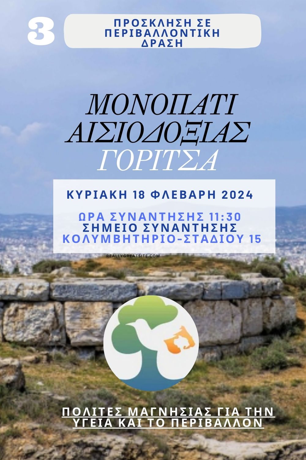 Ο Σύλλογος Πολίτες Μαγνησίας για την Υγεία και το Περιβάλλον προσκαλεί τους πολίτες την Κυριακή 18 Φλεβάρη στην 3η του περιβαλλοντική δράση. Όπως αναφέρεται σε σχετική ανακοίνωση, “Θα συναντηθούμε στο Κολυμβητήριο Βόλου (Σταδίου 15) στις 11.30 για να ακολουθήσουμε ένα άλλο μονοπάτι στη Γορίτσα με τη βοήθεια οδηγού-μέλους μας.
