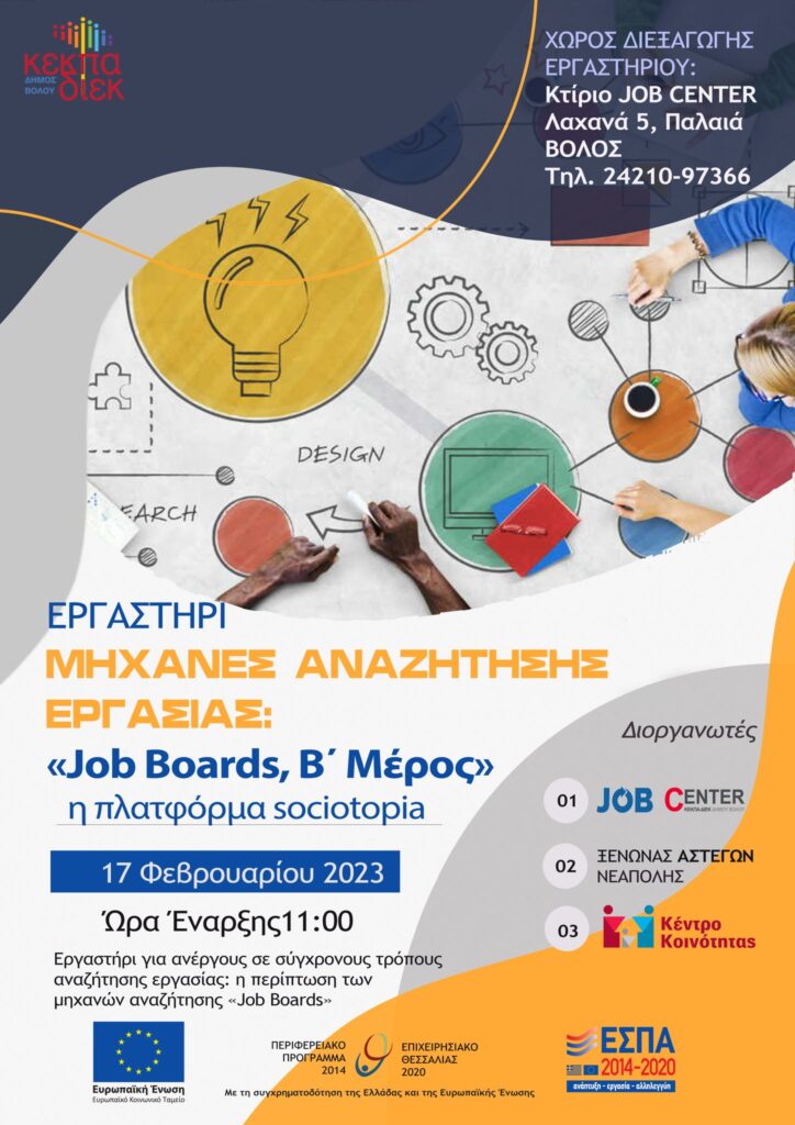 Την Παρασκευή 17/02, υλοποιήθηκε το τελευταίο μέρος του Βιωματικού εργαστηρίου “Μηχανές Αναζήτησης Εργασίας: Η πλατφόρμα SOCIOTOPIA“, το οποίο συνδιοργανώθηκε από το Γραφείο Διευκόλυνσης, Ενδυνάμωσης και Τεκμηρίωσης της Απασχόλησης “Job Center, το Κέντρο Κοινότητας και τον Ξενώνα Φιλοξενίας Αστέγων της ΚΕΚΠΑ-ΔΙΕΚ Δήμου Βόλου.
