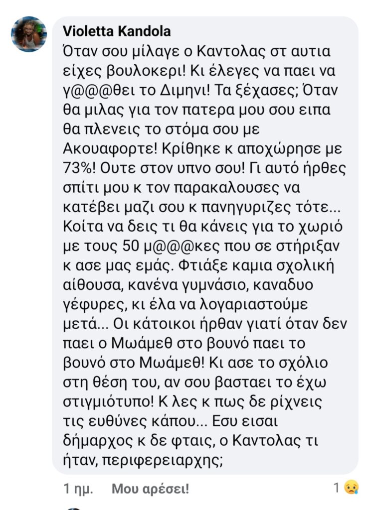“Όταν σου μίλαγε ο Καντολας στ αυτια είχες βουλοκερι! Κι έλεγες να παει να γ@@@θει το Διμηνι! Τα ξέχασες; Όταν θα μιλας για τον πατερα μου σου ειπα θα πλενεις το στόμα σου με Ακουαφορτε! Κρίθηκε κ αποχώρησε με 73%! Ουτε στον υπνο σου! Γι αυτό ήρθες σπίτι μου κ τον παρακαλουσες να κατέβει μαζι σου κ πανηγυριζες τότε… Κοίτα να δεις τι θα κάνεις για το χωριό με τους 50 μ@@@κες που σε στήριξαν κ ασε μας εμάς. Φτιάξε καμια σχολική αίθουσα, κανένα γυμνάσιο, καναδυο γέφυρες, κι έλα να λογαριαστούμε μετά… Οι κάτοικοι ήρθαν γιατί όταν δεν παει ο Μωάμεθ στο βουνό παει το βουνό στο Μωάμεθ! Κι ασε το σχόλιο στη θέση του, αν σου βασταει το έχω στιγμιότυπο! Κ λες κ πως δε ρίχνεις τις ευθύνες κάπου… Εσυ εισαι δήμαρχος κ δε φταις, ο Καντολας τι ήταν, περιφερειαρχης;”