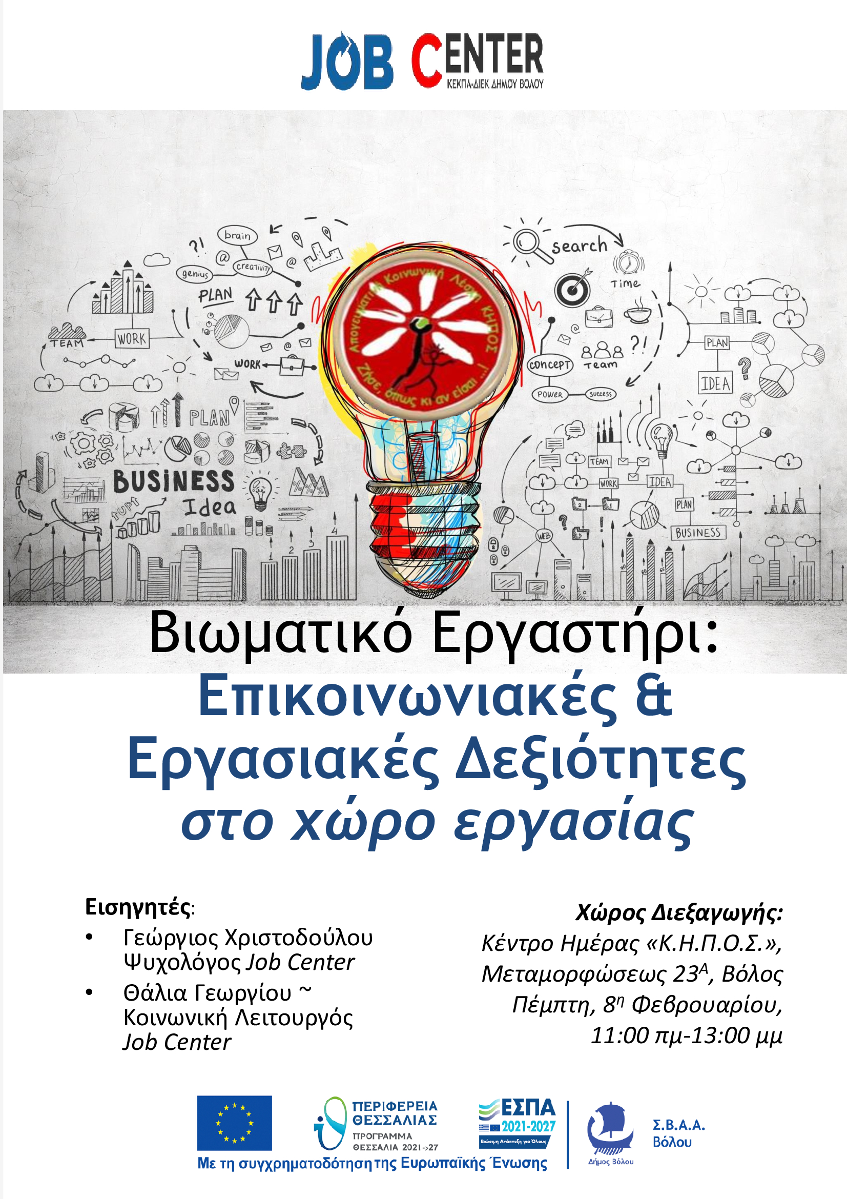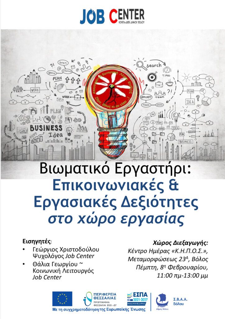 Η διεπιστημονική ομάδα του Γραφείου Διευκόλυνσης, Ενδυνάμωσης και Τεκμηρίωσης της Απασχόλησης (‘Job Center”) Δήμου Βόλου θα διεξάγει μία σειρά θεματικών και βιωματικών εργαστηρίων τον Φεβρουάριο και Μάρτιο του 2024 για στοχευμένο κοινό.