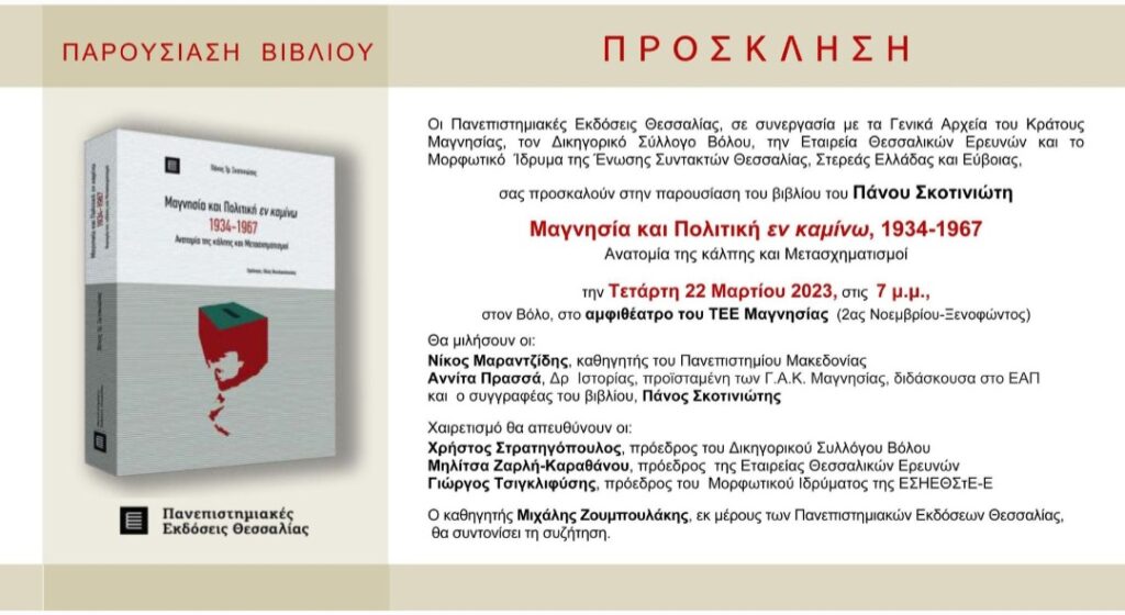 Το βιβλίο του Πάνου Σκοτινιώτη, «Μαγνησία και Πολιτική εν καμίνω, 1934-1967. Ανατομία της κάλπης και Μετασχηματισμοί», παρουσιάζεται αύριο Τετάρτη 22 Μαρτίου, στις 7 μ.μ., στον Βόλο, στο αμφιθέατρο του ΤΕΕ Μαγνησίας (2ας Νοεμβρίου-Ξενοφώντος).