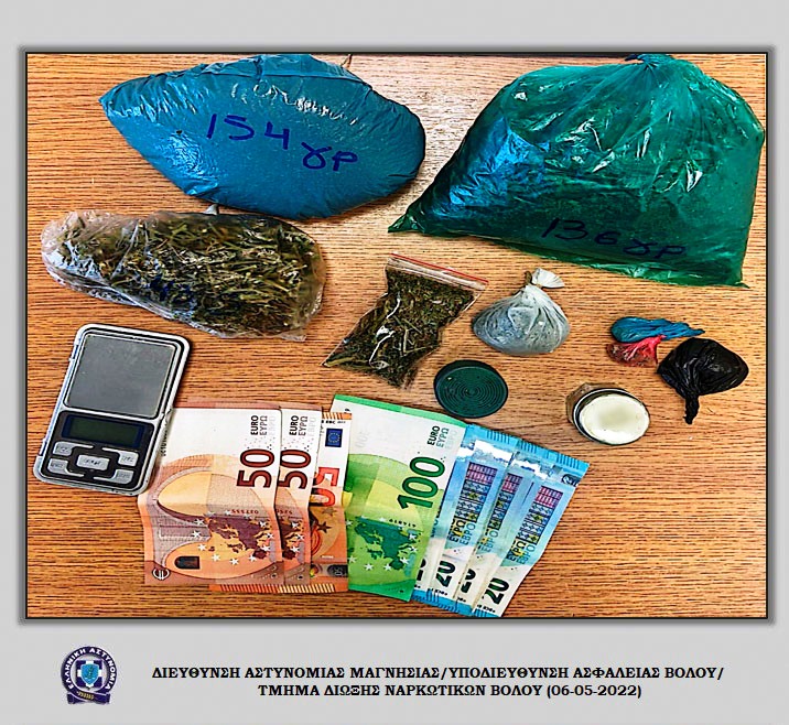 Η έρευνα της αστυνομίας στο σπίτι του εντόπισε έξι νάιλον συσκευασίες, ένα γυάλινο βάζο με ποσότητες ακατέργαστης κάνναβης, συνολικού βάρους 307,72 γραμμαρίων, μία νάιλον συσκευασία με ποσότητα φυτικών αποσπασμάτων ακατέργαστης κάνναβης, βάρους 43,5 γραμμαρίων. Επίσης μια συσκευασία με μείγμα καπνού και ακατέργαστης κάνναβης, συνολικού βάρους 7,78 γραμμαρίων, μία ηλεκτρονική ζυγαριά, έναν τρίφτη κάνναβης και χρηματικό ποσό 450€.