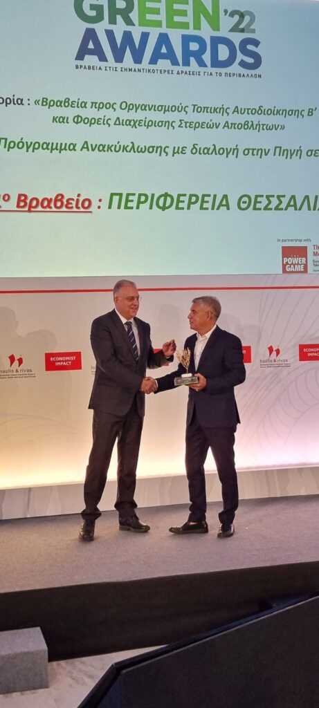 Με το πρώτο βραβείο των GREEN AWARDS 2022, στην κατηγορία «Πρόγραμμα Ανακύκλωσης με διαλογή στην Πηγή σε Περιφέρεια» τιμήθηκε η Περιφέρεια Θεσσαλίας, στο διαγωνιστικό θεσμό που διοργανώνουν ο διεθνής ενημερωτικός φορέας Τhe Εconomist και το powergame.gr, επιβραβεύοντας τις σημαντικότερες δράσεις Οργανισμών Τοπικής Αυτοδιοίκησης, δημοσίων φορέων και επιχειρήσεων για το περιβάλλον. Το βραβείο παρέλαβε ο Περιφερειάρχης Θεσσαλίας Κώστας Αγοραστός από τον Υπουργό Προστασίας του Πολίτη Τάκη Θεοδωρικάκο, κατά τη διάρκεια του διεθνούς Αναπτυξιακού Συνεδρίου «The Second Thessaloniki Metropolitan Summit», στη Θεσσαλονίκη, παρουσία Ελλήνων και ξένων αξιωματούχων.