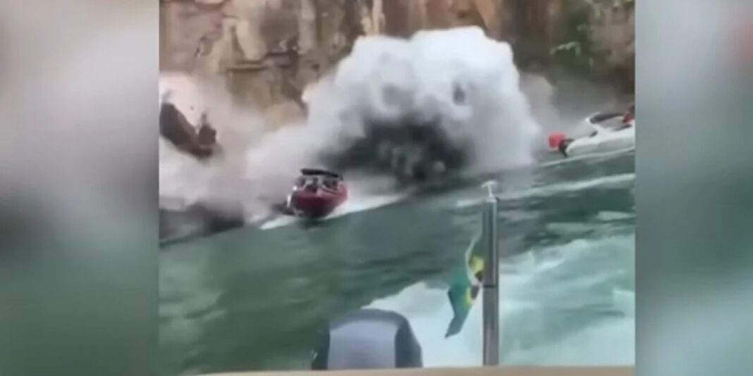 Πελώριο κομμάτι του επιβλητικού όγκου βράχων ξαφνικά αποκολλήθηκε από το φαράγγι και έπεσε πάνω σε σκάφη που έπλεαν στα γαλαζοπράσινα νερά της λίμνης Φούρνας, στην περιοχή Καπιτόλιου, στην πολιτεία Μίνας Ζεράις.
