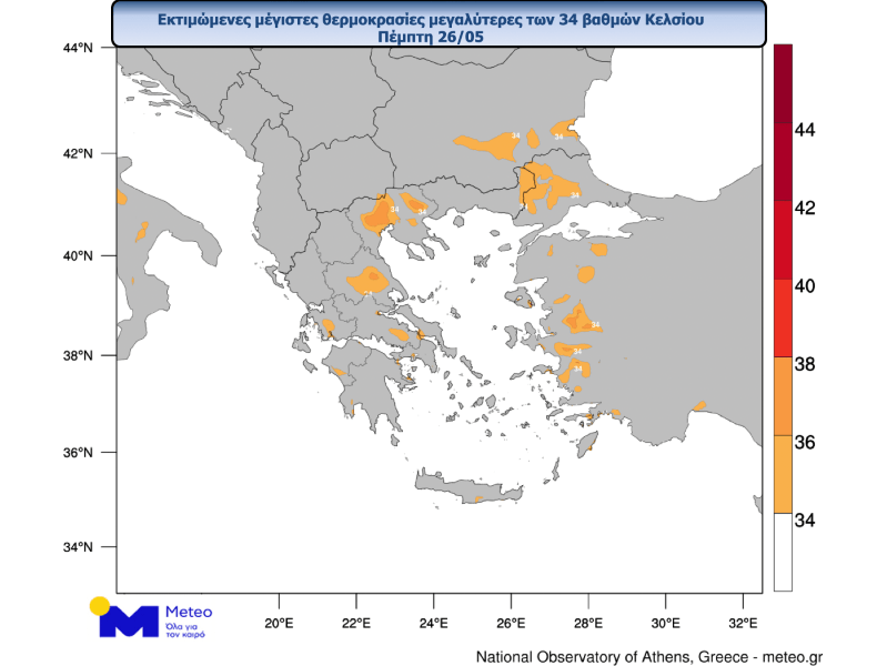 Ωστόσο, την Πέμπτη 26/5 και την Παρασκευή 27/5 η θερμοκρασία αναμένεται να ξεπεράσει τους 34 βαθμούς σε αρκετές περιοχές κυρίως της ηπειρωτικής χώρας καθώς και μεμονωμένα σε νησιωτικά τμήματα, ενώ τοπικά αναμένεται να ξεπεράσει και τους 36-37 βαθμούς Κελσίου σε τμήματα της Θεσσαλίας, της Στερεάς και της Μακεδονίας.