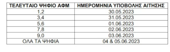 Η πλατφόρμα θα ανοίγει σταδιακά ανάλογα με το τελευταίο ψηφίο του ΑΦΜ των ενδιαφερόμενων δικαιούχων έως τις 05.06.2023 και ώρα 23:59, οπότε θα παραμείνει ανοικτή για όλα τα ψηφία ΑΦΜ, ως εξής: