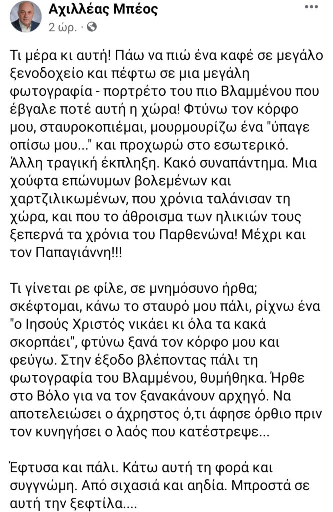 Ο ποδοσφαιρικός παράγοντας που θέλει τους “οικογενειαρχηδες” στο γήπεδο και παίζει κλωτσιές στις κερκίδες… ο Δήμαρχος που κάνει συλλογή από φωτογραφίες με τους Υπουργούς της ΝΔ, επιτέθηκε με αγοραίους για μια ακόμη φορά χαρακτηρισμούς κατά του πρώην πρωθυπουργού. Βεβαι σε αυτές τις περιπτώσεις σημασία έχει πάντα “ποιος είναι αυτός που λέει τί” και στην περίπτωσή μας είναι ο Μπέος…