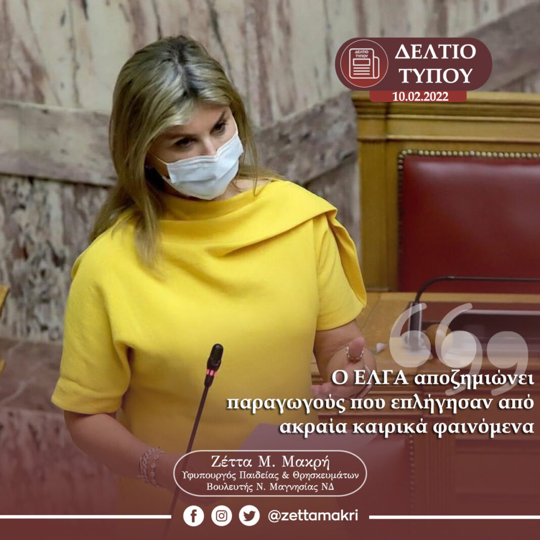 Κατόπιν επικοινωνίας με την Διοίκηση του ΕΛΓΑ η υφυπουργός Παιδείας και Θρησκευμάτων και βουλευτής Ν. Μαγνησίας Ζέττα Μ. Μακρή, ενημερώθηκε πως ένα εκατομμύριο δεκαεννέα χιλιάδες ευρώ (1.019.000 €) καταβάλλονται, σήμερα Πέμπτη 10 Φεβρουαρίου, από τον ΕΛΓΑ στους δικαιούχους παραγωγούς της Μαγνησίας, που οι καλλιέργειές τους ζημιώθηκαν από τον “Παγετό της Άνοιξης 2021” αλλά και για ζημιές που προκάλεσαν άλλα έντονα καιρικά φαινόμενα.