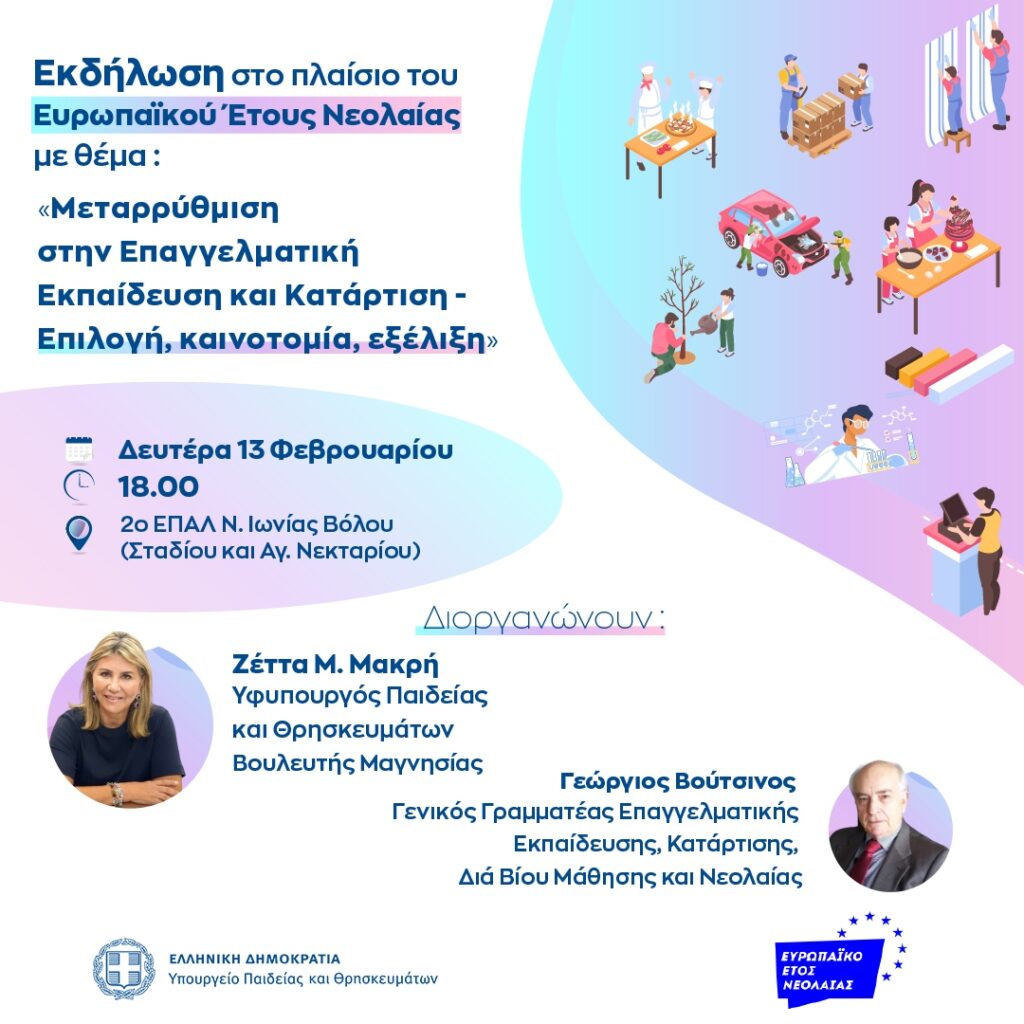 Με πρωτοβουλία της υφυπουργού Παιδείας και Θρησκευμάτων και βουλευτή Ν. Μαγνησίας κ. Ζέττας Μ. Μακρή και σε συνεργασία με τον Γενικό Γραμματέα Επαγγελματικής Εκπαίδευσης, Κατάρτισης, Διά Βίου Μάθησης και Νεολαίας κ. Γιώργου Βούτσινου διοργανώνεται εκδήλωση, με θέμα: «Μεταρρύθμιση στην Επαγγελματική Εκπαίδευση και Κατάρτιση – Επιλογή, Καινοτομία, Εξέλιξη», στο 2ο ΕΠΑΛ Ν. Ιωνίας Βόλου, την Δευτέρα 13 Φεβρουαρίου 2023 και ώρα 18.00 μ.μ.